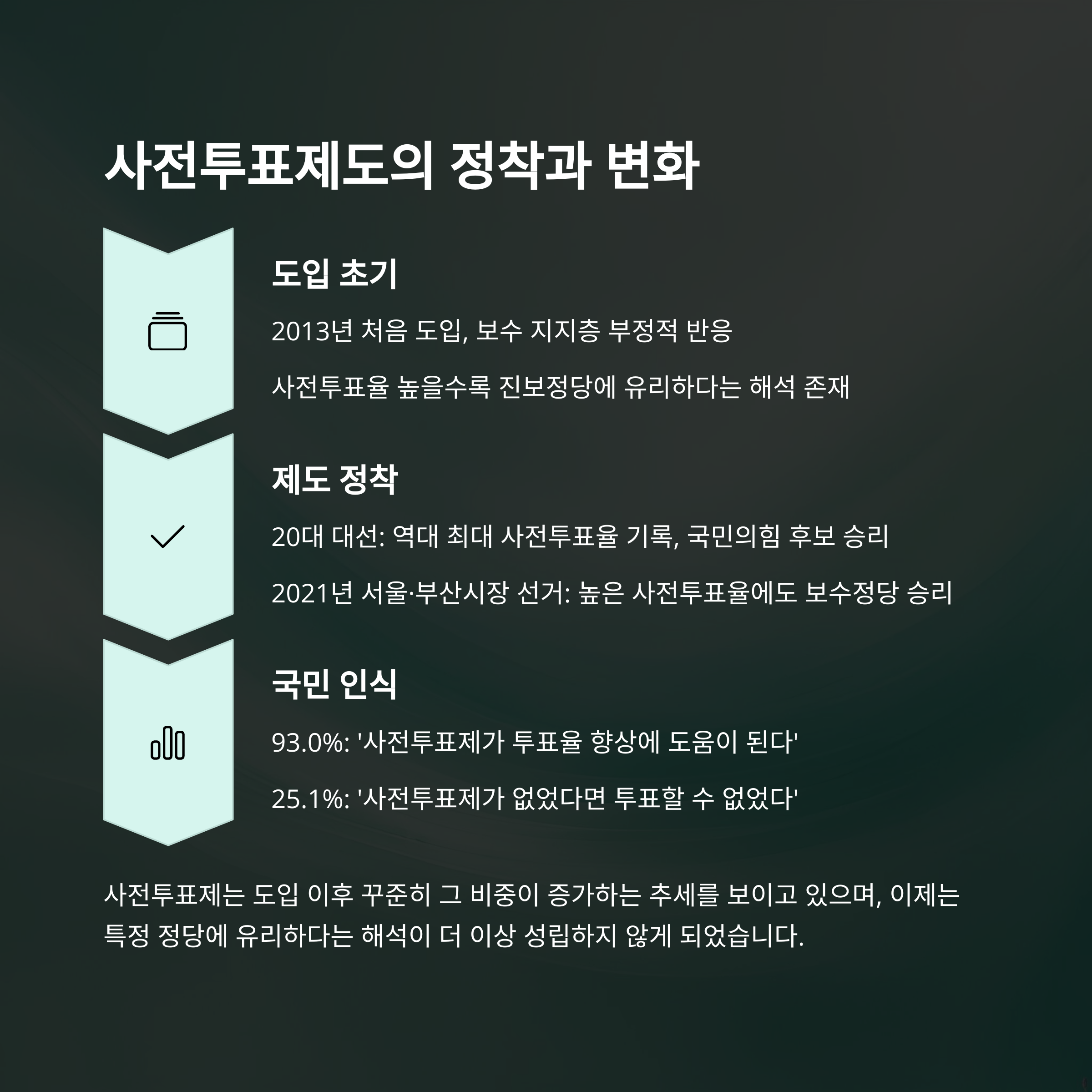 사전투표제는 2013년 도입 이후 점진적으로 유권자의 선택지로 자리 잡아왔습니다. 과거에는 보수 진영에서 불신하는 경향이 강했으나, 2020년대에 들어서며 진보·보수 양 진영 모두 적극적으로 활용하게 되었죠. 특히 2022년 대선과 2021년 서울·부산시장 보궐선거에서 보수 정당이 승리한 사례는 ‘높은 사전투표율 = 진보 우세’라는 공식을 무너뜨렸습니다. 이제 사전투표는 유권자의 생활 패턴을 고려한 ‘합리적인 선택’으로 자리잡았다고 봐야 해요.