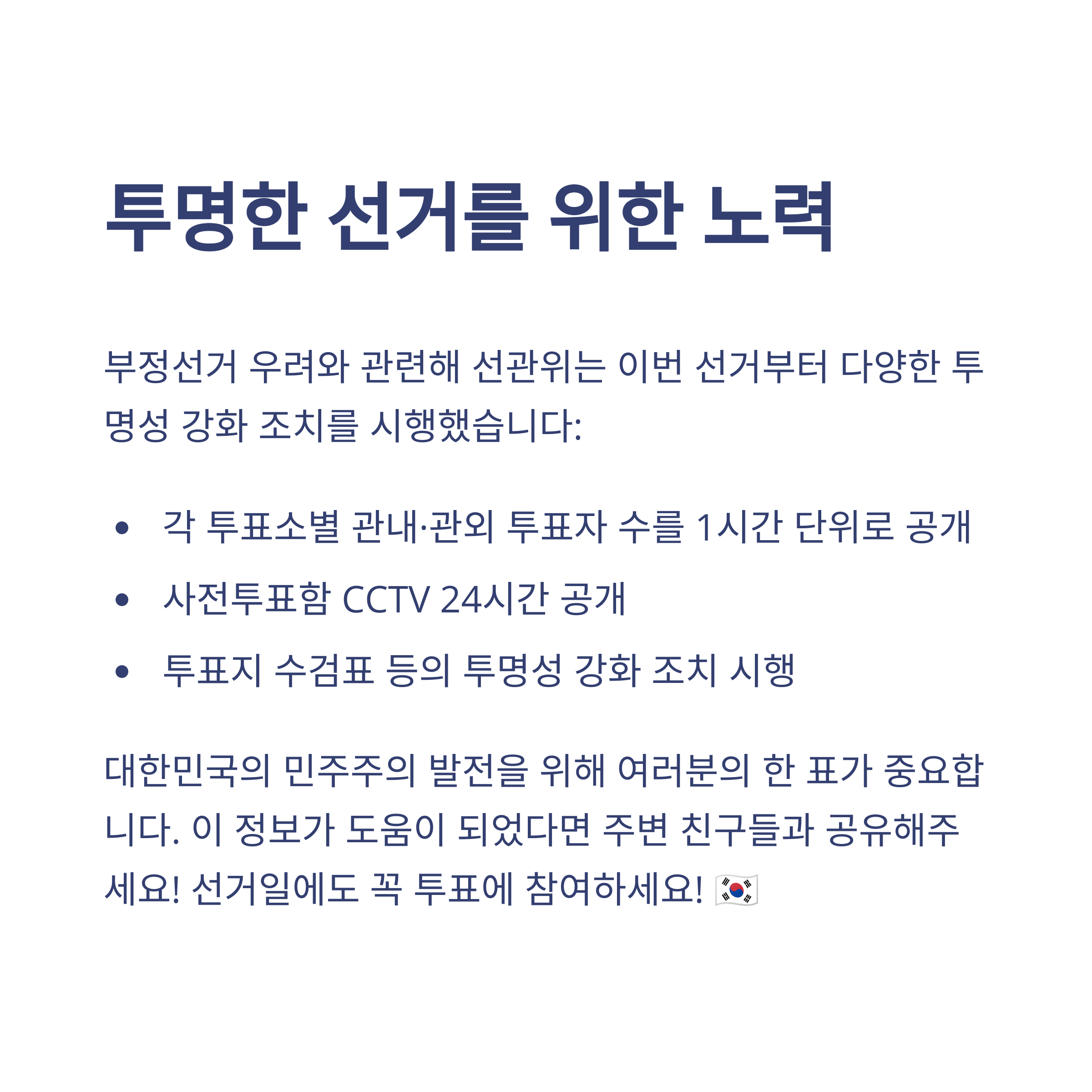 1시간 단위로 투표자 수를 공개하고, 투표함 CCTV 실시간 중계, 수개표 실시간 공개 등 투명성을 대폭 강화했습니다.