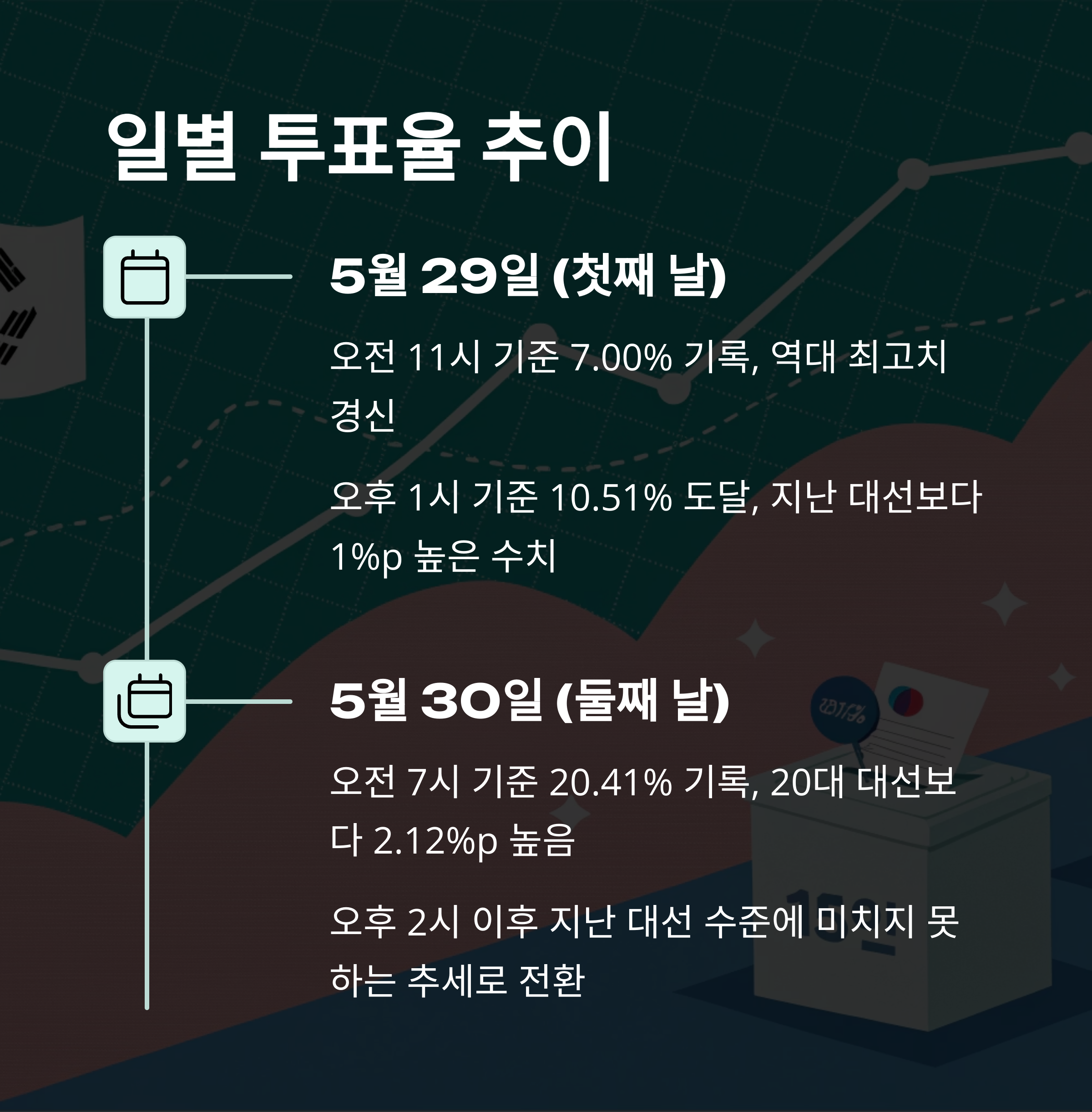 첫째 날인 5월 29일, 오전 11시 기준 7.00%, 오후 1시 기준 10.51%로 역대 최고 수준의 시간대별 투표율을 기록했습니다. 반면 둘째 날인 30일은 오전 7시에 20.41%까지 급등했지만, 이후 상승세가 주춤하며 최종 투표율이 34%대에서 마무리되었습니다.