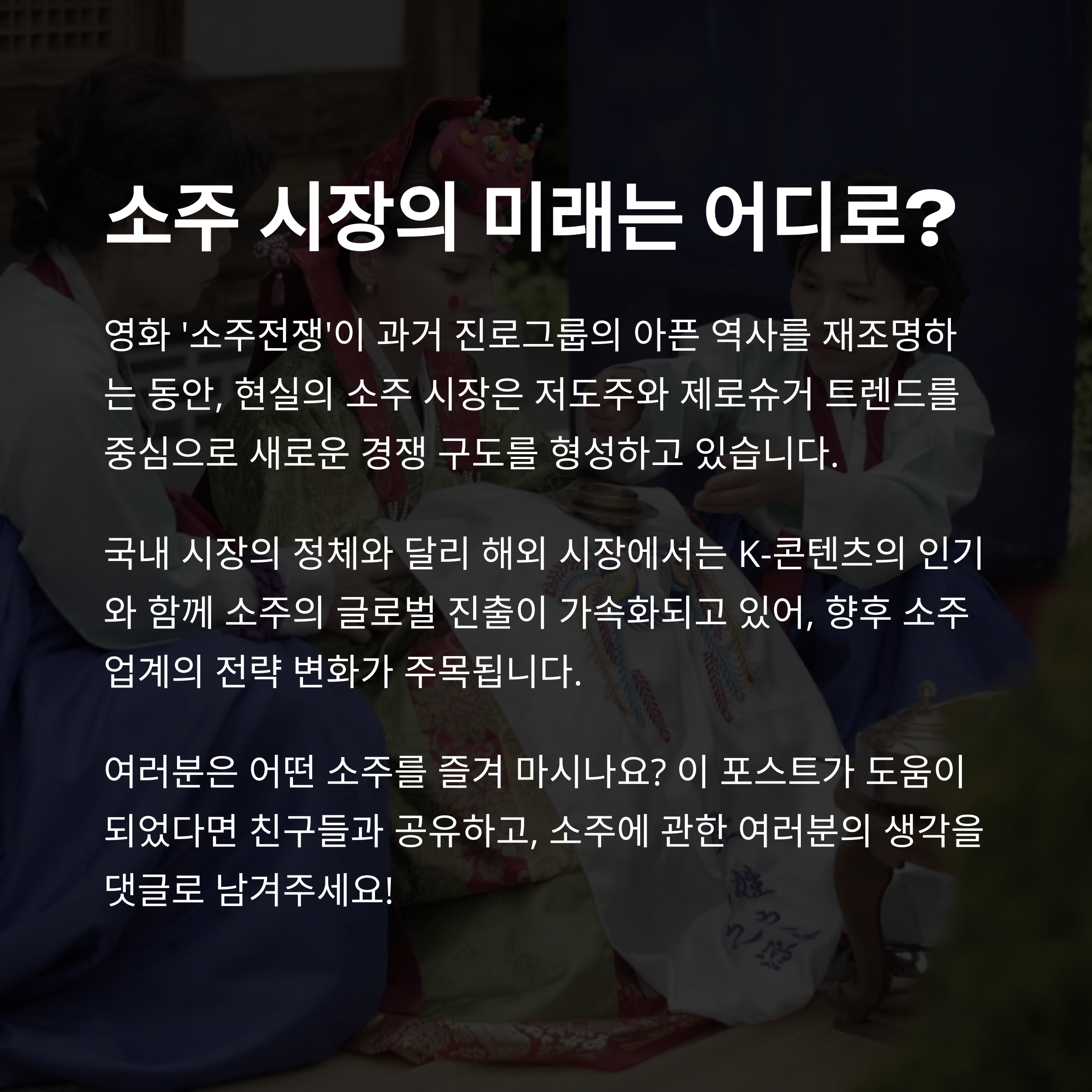 안녕하세요, 여러분. 어제 친구들과 '소주전쟁'이라는 영화를 보고 왔어요. 단순한 소주 이야기가 아니라 기업 인수, 금융 위기, 그리고 인간의 욕망이 뒤엉킨 리얼한 이야기더라고요. 영화를 보며 자연스레 요즘 소주 시장의 판도 변화도 떠오르더군요. 그래서 오늘은 영화 속 이야기부터 현실 시장의 뜨거운 경쟁, 저도주 트렌드, 그리고 글로벌 K-소주의 활약까지, 지금 한국 소주 시장에서 벌어지고 있는 모든 걸 정리해보려 합니다. 제 개인적인 감정과 관찰도 듬뿍 섞어볼게요. 따뜻한 소주 한잔 기울이며 읽어주세요 :)