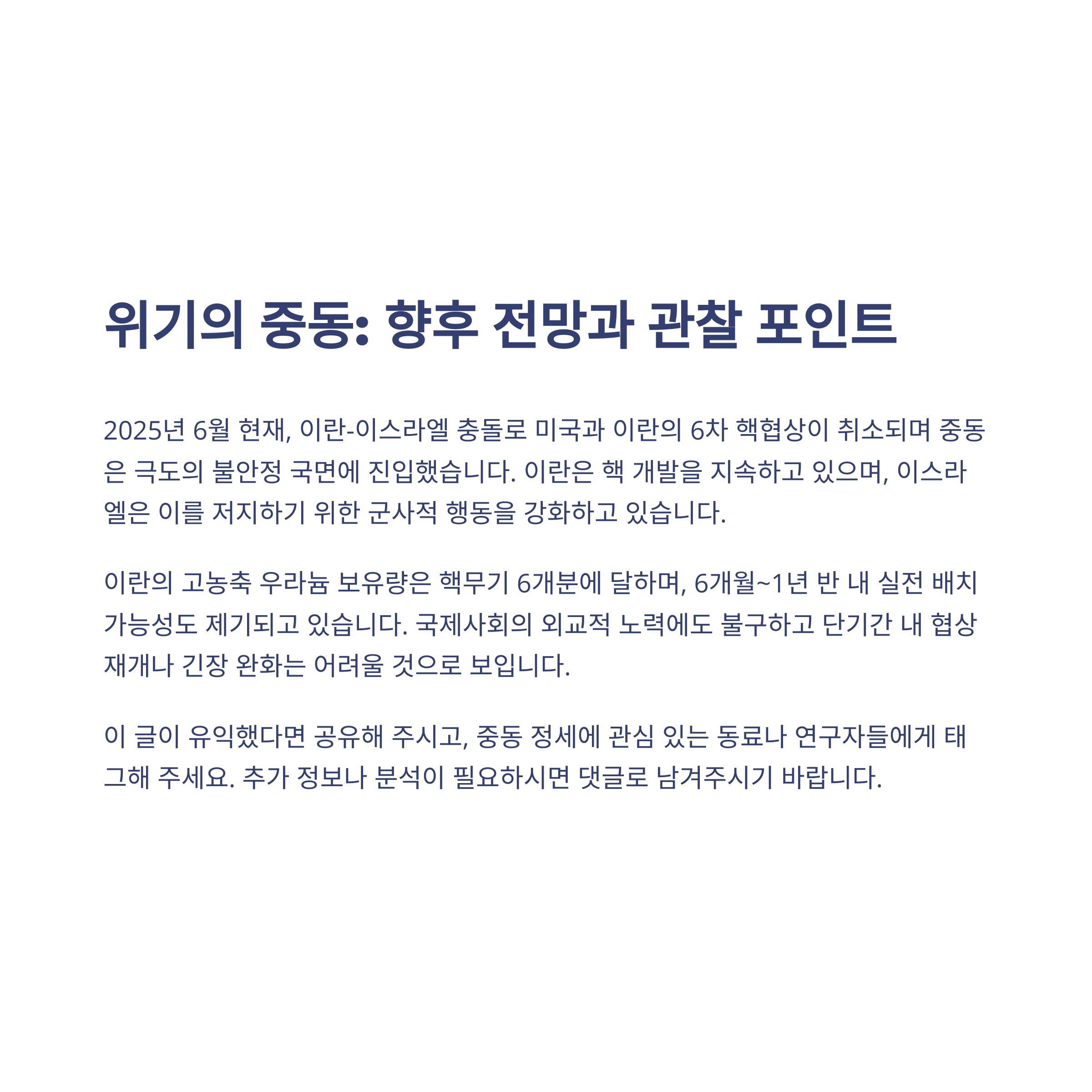태그: 이란핵, 이스라엘공습, 중동정세, 미국이란협상, 핵협상결렬, 고농축우라늄, 군사충돌, 핵전쟁위기, 국제사회반응, 외교해법
