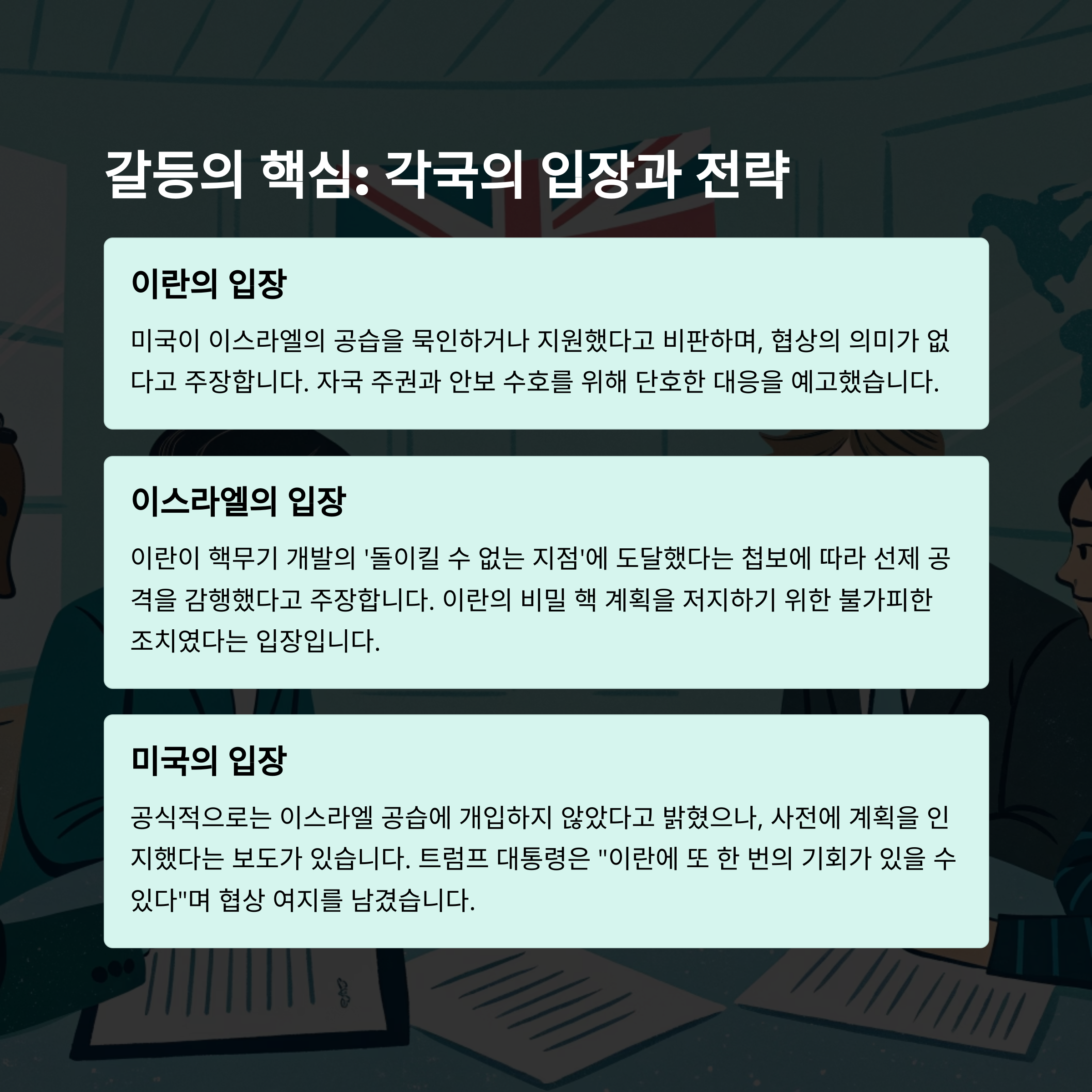 | 이란 | 미국이 이스라엘 공격을 사실상 묵인했고, 자국 안보 위협에 대해 강력히 반발 |