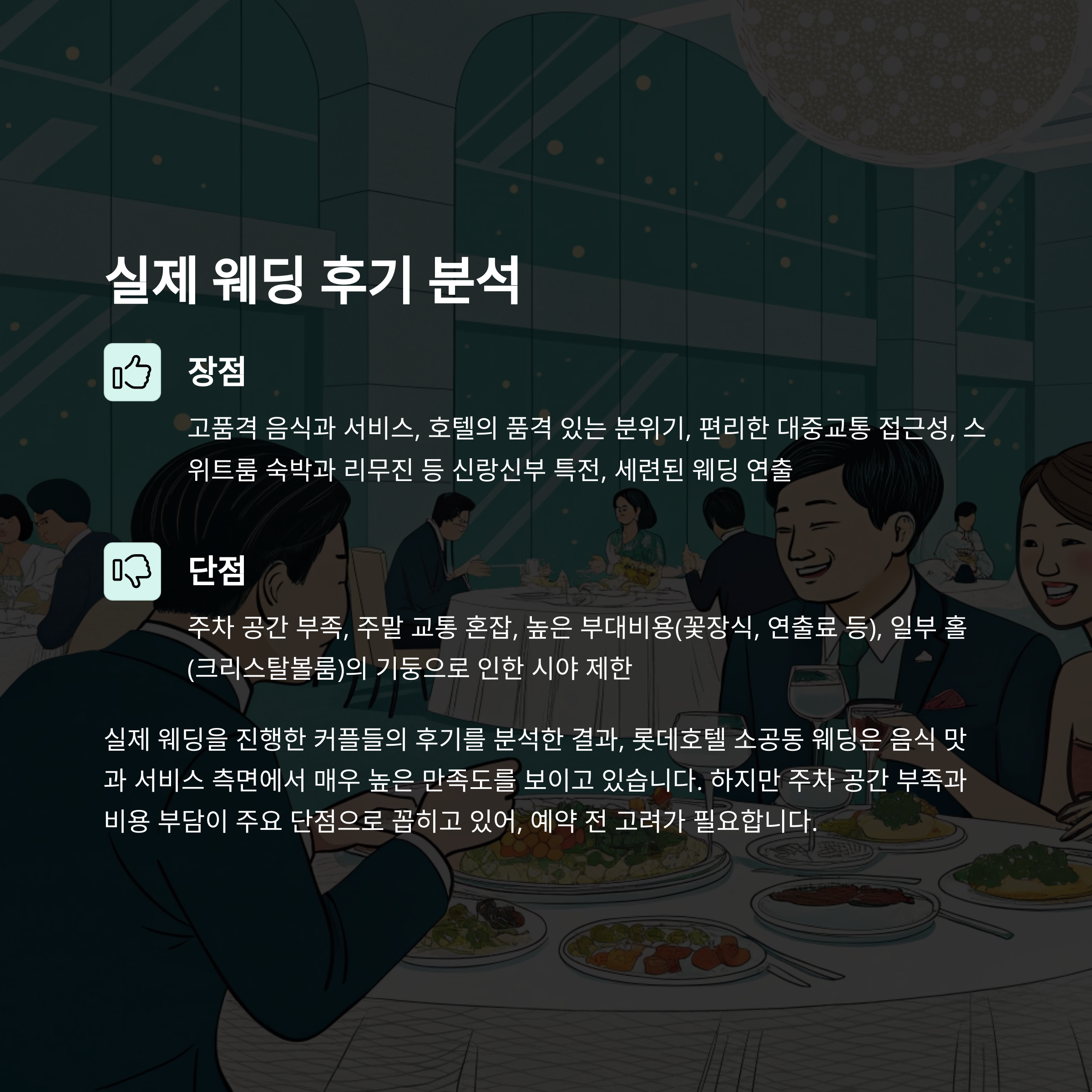 직접 결혼식을 치른 분들, 그리고 하객으로 참석한 이들의 후기를 보면 롯데호텔 소공동 웨딩의 강점과 단점이 명확히 드러납니다. 서비스나 음식은 정말 ‘명불허전’이라는 반응이 많지만, 역시나 주차와 비용 부담은 단골 아쉬움으로 등장하더라고요.
