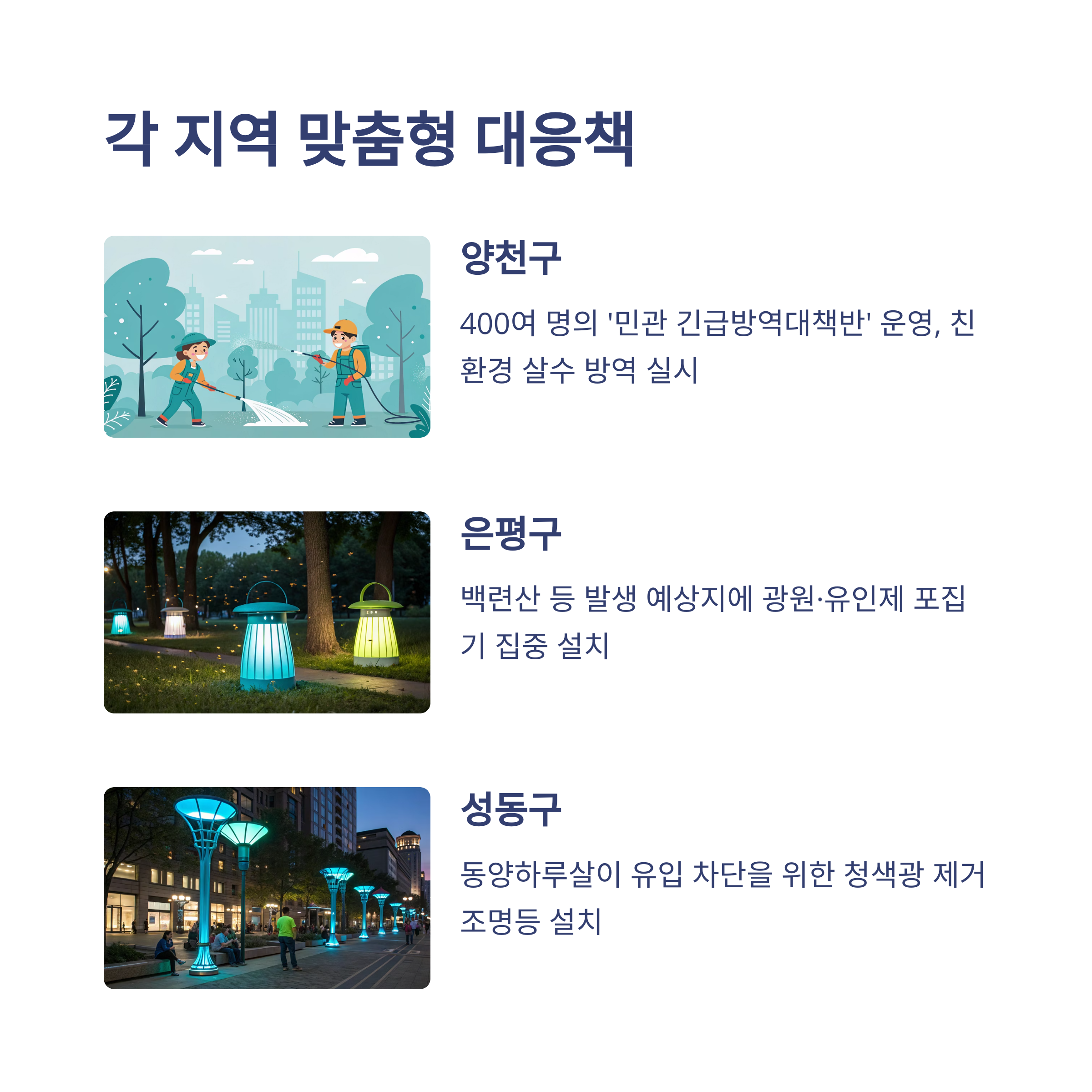 자치구마다 러브버그를 퇴치하는 방식이 조금씩 다릅니다. 각 구청이 어떤 방식으로 대응하고 있는지 살펴보면 나에게 맞는 팁도 얻을 수 있어요. 예를 들면 양천구는 긴급 방역대책반을 400명 넘게 구성해서 살수 방역을 강화했고, 성동구는 청색광 제거 등 조명 자체를 개선하는 방식으로 접근했죠.