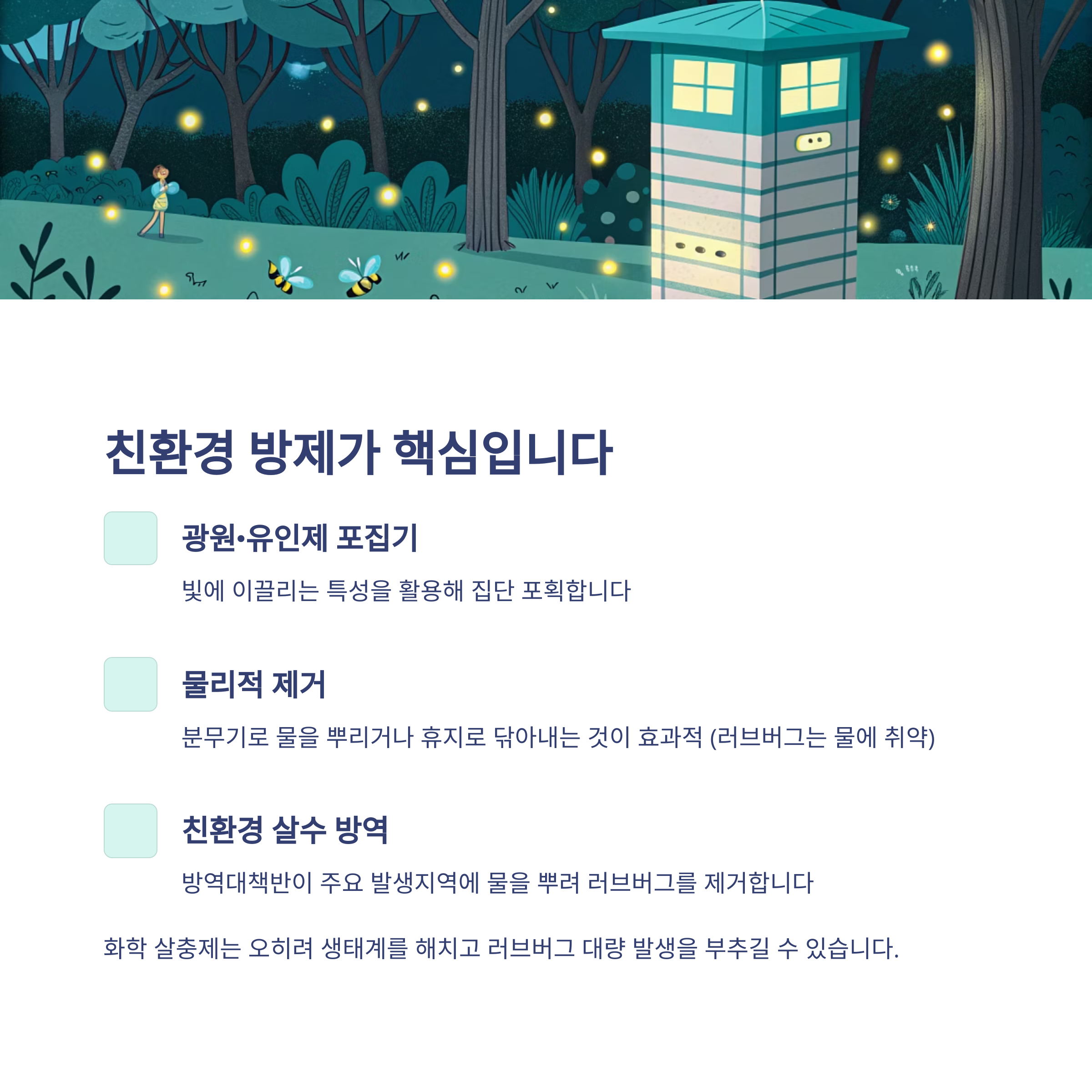 | 광원 유인 포집기 설치 | 러브버그의 빛 반응성 이용, 집중 포획 |