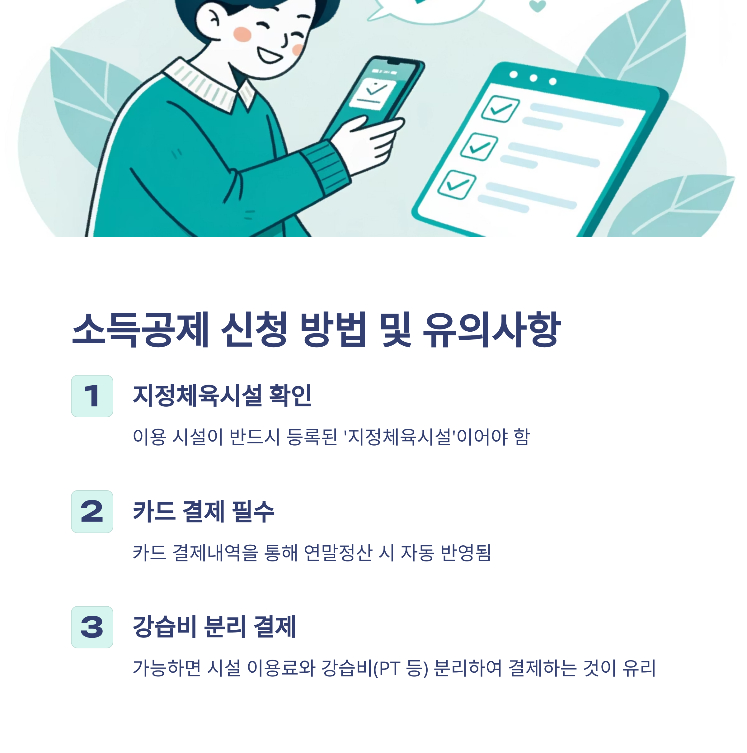 공제대상은 민간 체육시설 약 16,000개, 공공체육시설 약 1,300개 등 전국 총 17,300여 개소에 달합니다. 자칫 놓치기 쉬운 정책이지만, 정확히 알고만 있으면 꽤 쏠쏠하게 챙길 수 있는 제도랍니다.