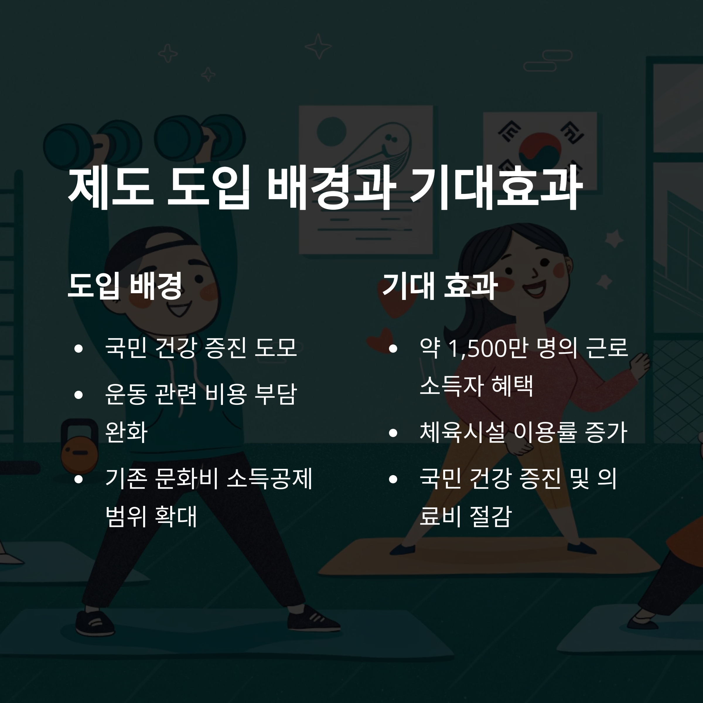 이번 제도는 단순한 세제 혜택을 넘어서 국민 건강 증진을 목표로 하고 있어요. 기존에는 책, 공연, 박물관 이용 같은 문화비만 공제가 가능했는데, 이젠 운동도 포함되면서 실질적인 혜택 범위가 크게 넓어진 셈이죠.