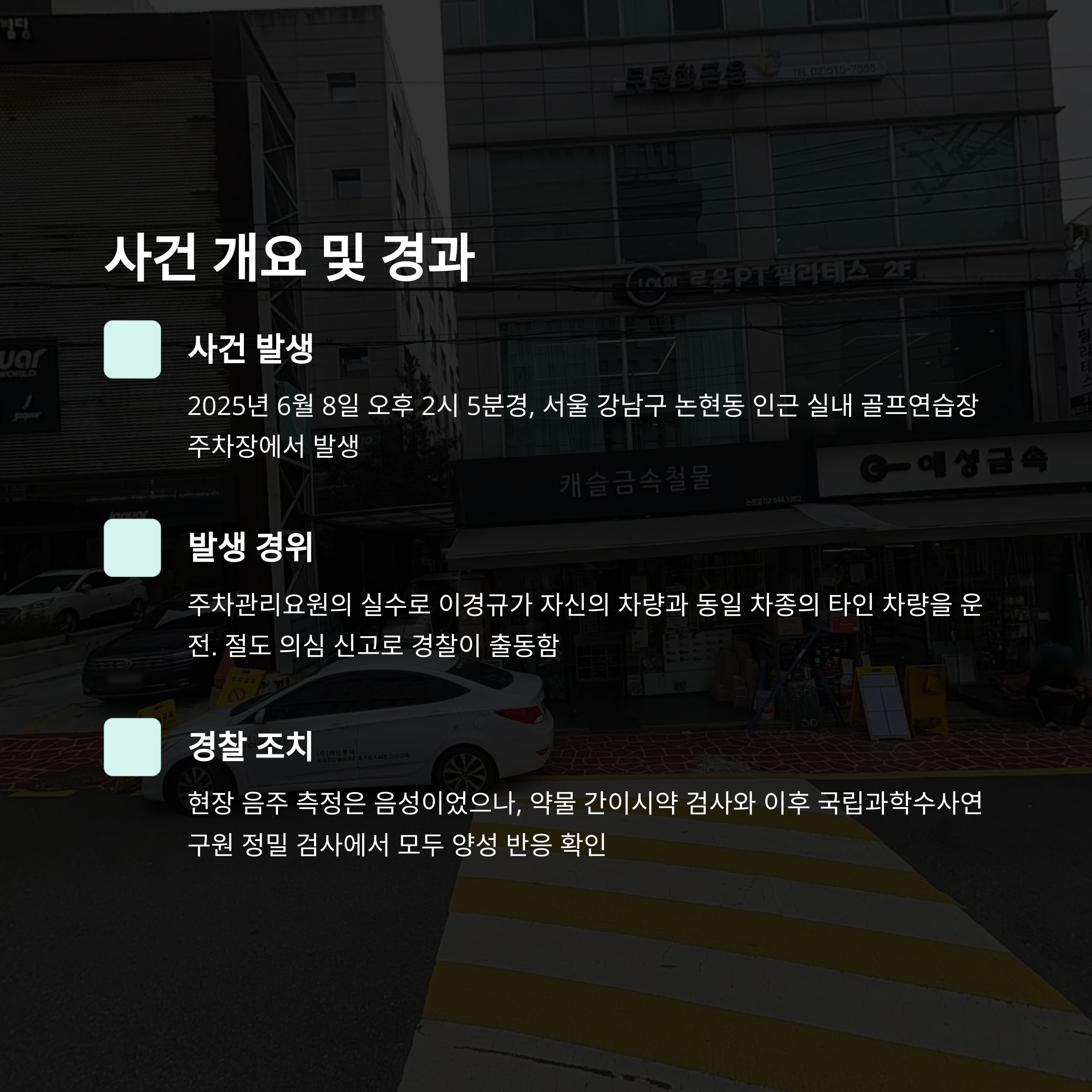 2025년 6월 8일 오후 2시 5분, 서울 강남구 논현동에 위치한 실내 골프연습장 주차장에서 뜻밖의 사건이 벌어졌습니다. 이경규 씨는 주차장에서 차량을 옮기던 중, 주차요원의 실수로 자신의 차량과 동일한 차종의 타인 차량을 잘못 인식하고 운전하게 되었고, 이를 본 제3자의 신고로 인해 절도 의심 신고가 접수되었습니다. 경찰이 현장에 출동했을 때 음주 측정은 음성이었으나, 약물 간이 검사에서는 양성 반응이 나왔고, 이후 국립과학수사연구원 정밀 검사에서도 벤조디아제핀 성분이 확인되었습니다.