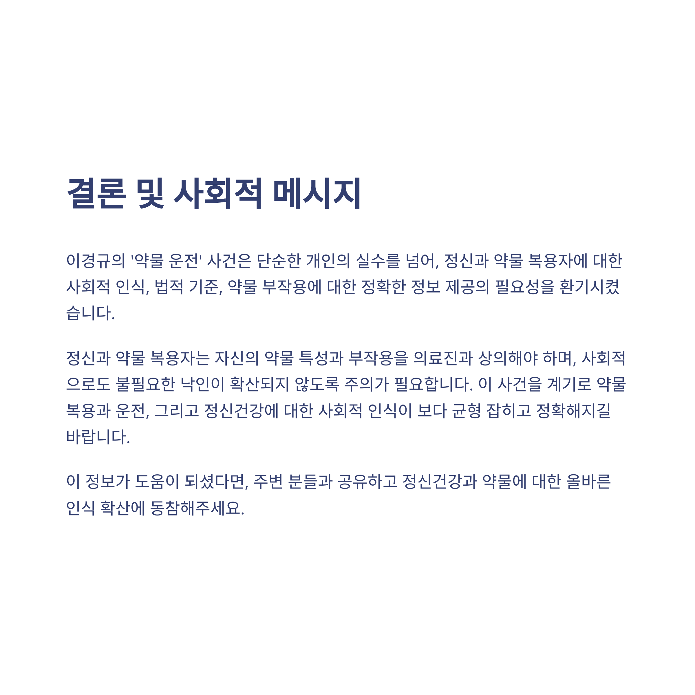 이번 이경규 씨 사건을 보며, 우리 사회가 어디쯤 서 있는지, 그리고 우리가 얼마나 더 따뜻하고 정확한 시선으로 정신건강 문제를 바라볼 수 있을지 고민하게 됐습니다. 약물 운전에 대한 법적 경각심은 분명 필요하지만, 동시에 그 이면에 있는 사람들의 이야기를 외면해선 안 된다고 생각해요. 앞으로도 비슷한 사건이 발생하지 않도록, 우리 모두가 정보를 제대로 알고 행동할 수 있었으면 합니다. 혹시 이 글이 도움이 되셨다면 주변에도 꼭 공유해 주세요. 댓글로 여러분의 생각도 꼭 남겨주시고요!
