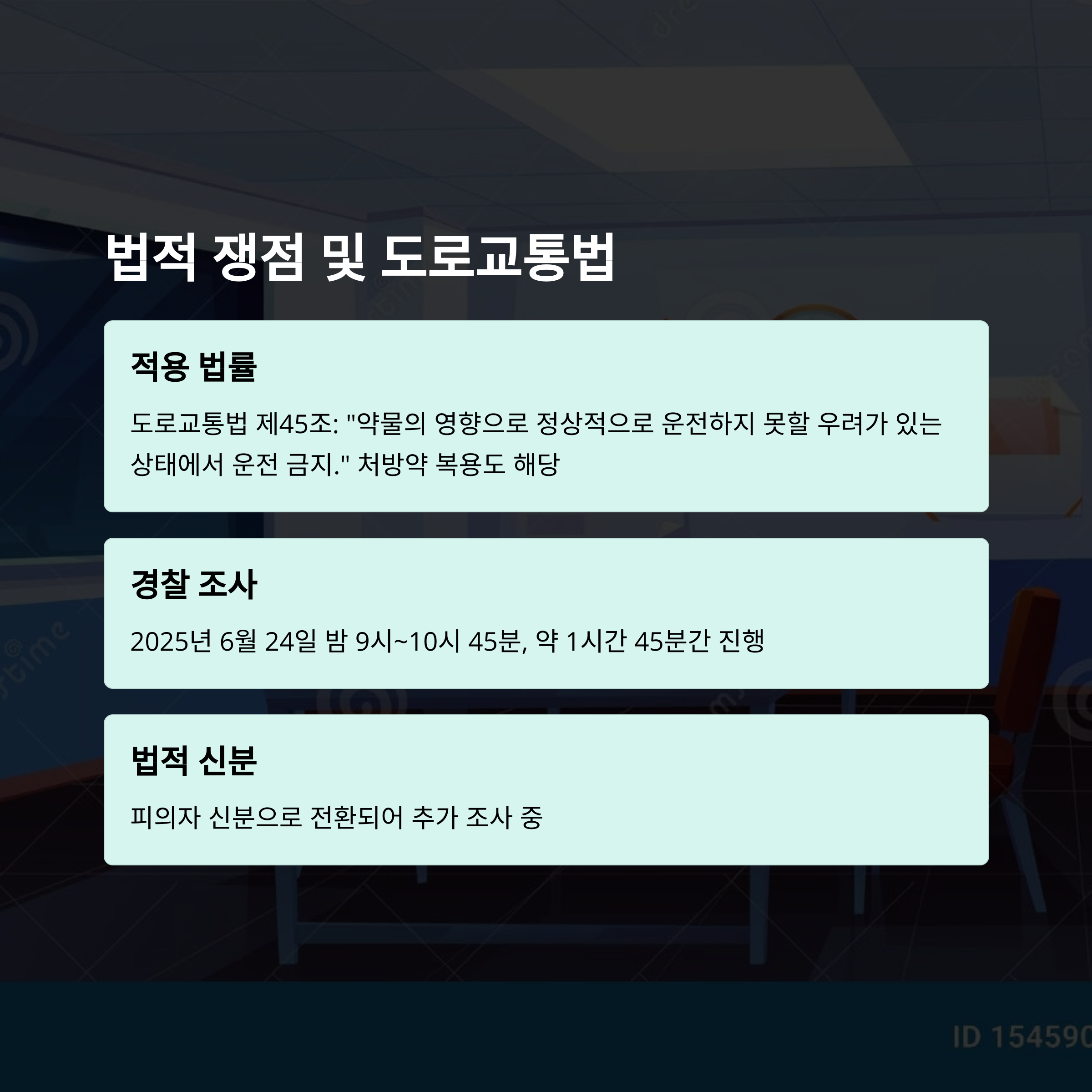 - 적용 법률: 도로교통법 제45조 - “약물의 영향으로 정상 운전이 불가능한 상태에서의 운전 금지”