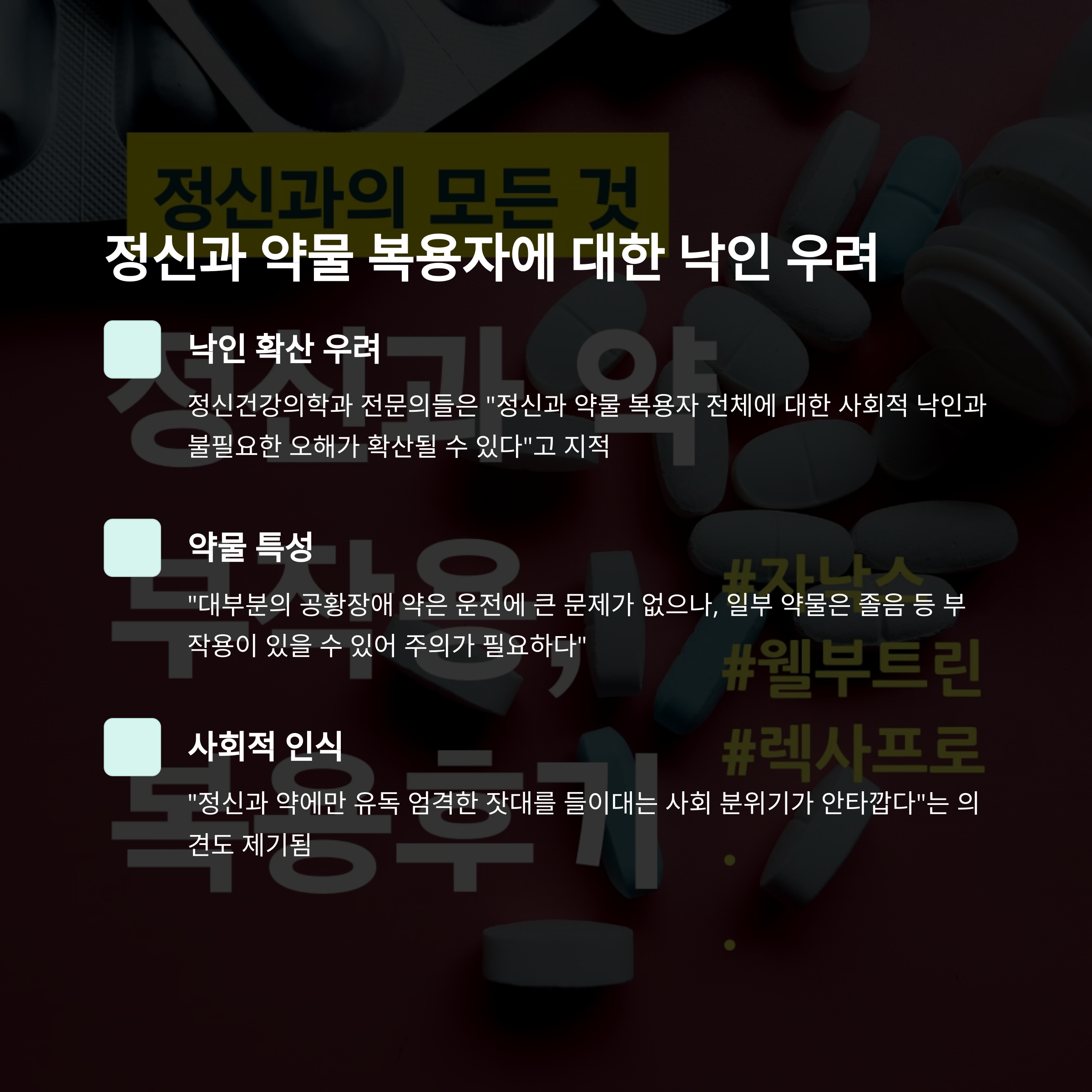 또한 의료진들은 “정신과 약물 복용자에게만 유독 엄격한 잣대를 들이대는 것은 사회적 편견의 결과”라고 꼬집으며, 보다 균형 잡힌 시각이 필요하다고 조언합니다. 이러한 분위기 속에서 정신과 치료를 꺼리게 되는 악순환이 반복되지 않도록, 언론과 사회 모두가 신중한 접근을 해야 할 시점입니다.