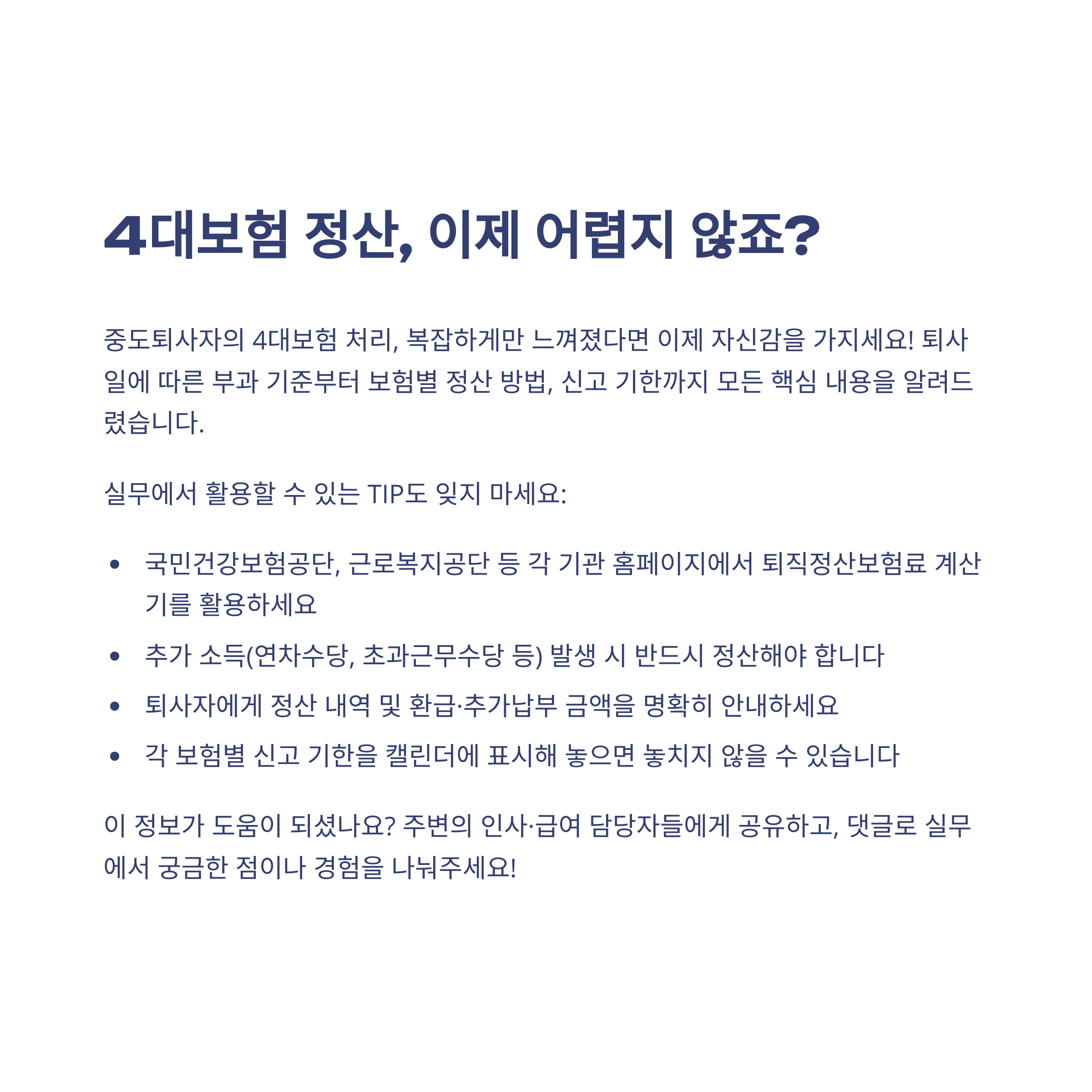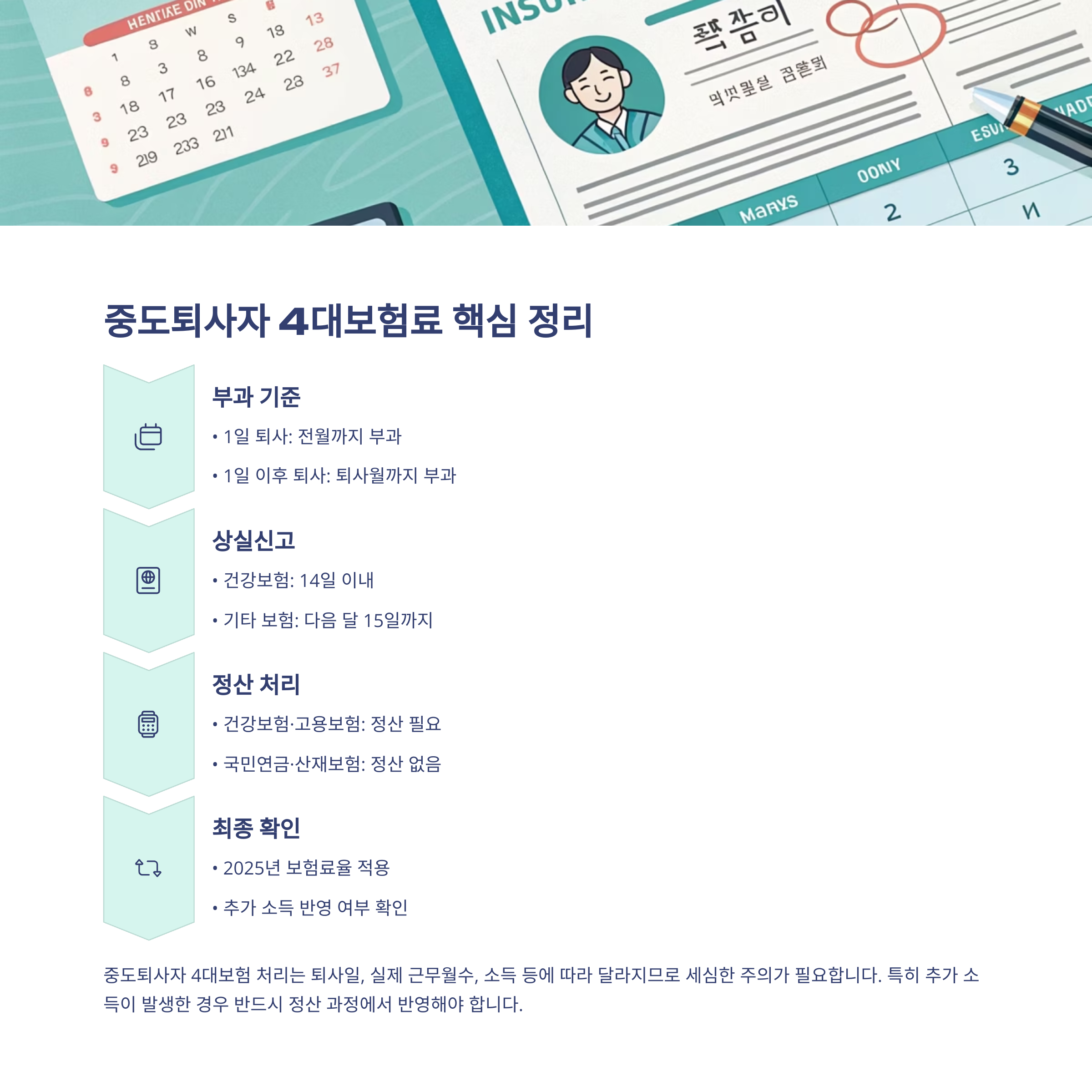퇴사정산, 4대보험, 중도퇴사, 고용보험, 건강보험, 국민연금, 산재보험, 보험료정산, 퇴사처리, 실무가이드