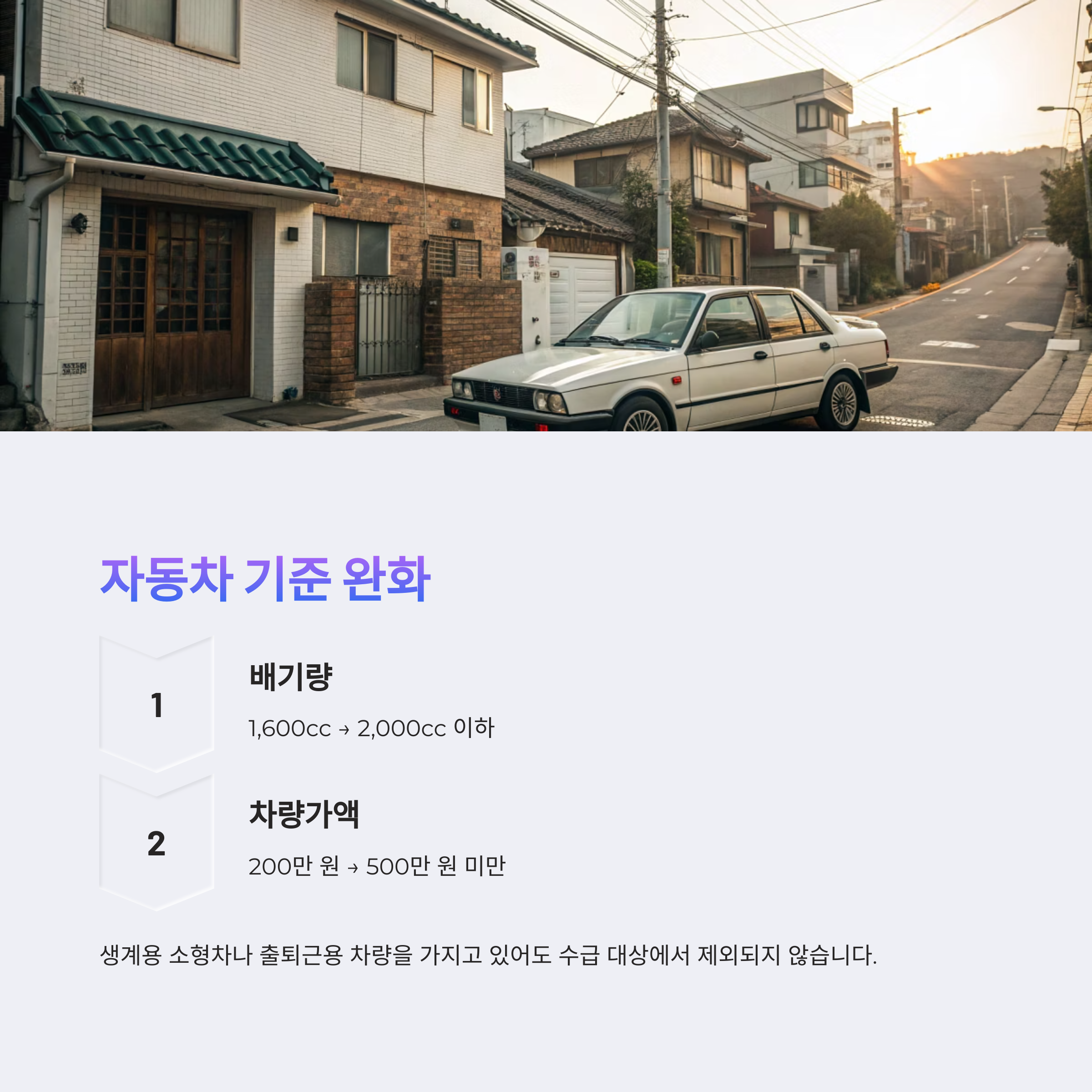 2025년부터는 2,000cc 이하, 차량가액 500만 원 미만까지 허용되어 차량 보유자도 수급 대상이 될 수 있습니다.