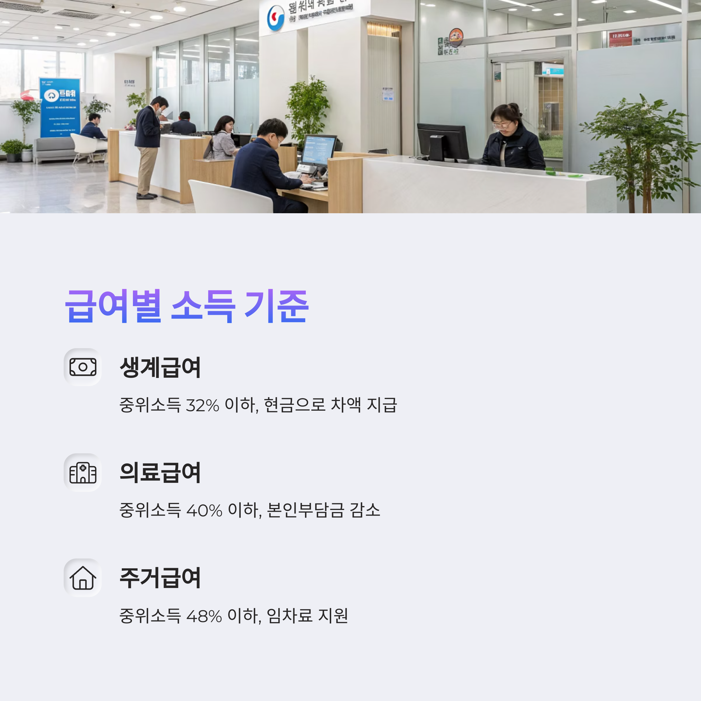 - 의료급여: 중위소득 40% 이하, 의료비 지원 및 본인부담 경감