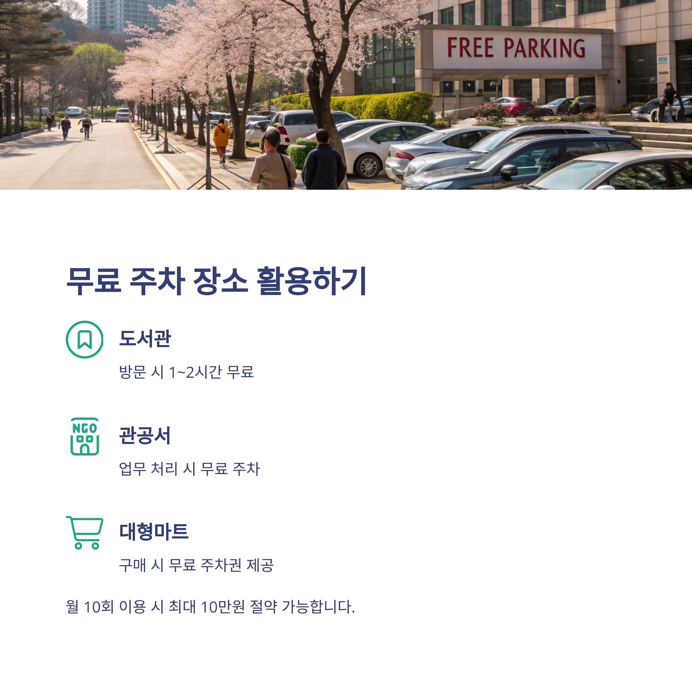 주민센터, 도서관, 대형마트, 문화시설 등 방문 목적이 있으면 무료 주차가 제공되는 곳이 꽤 많습니다.