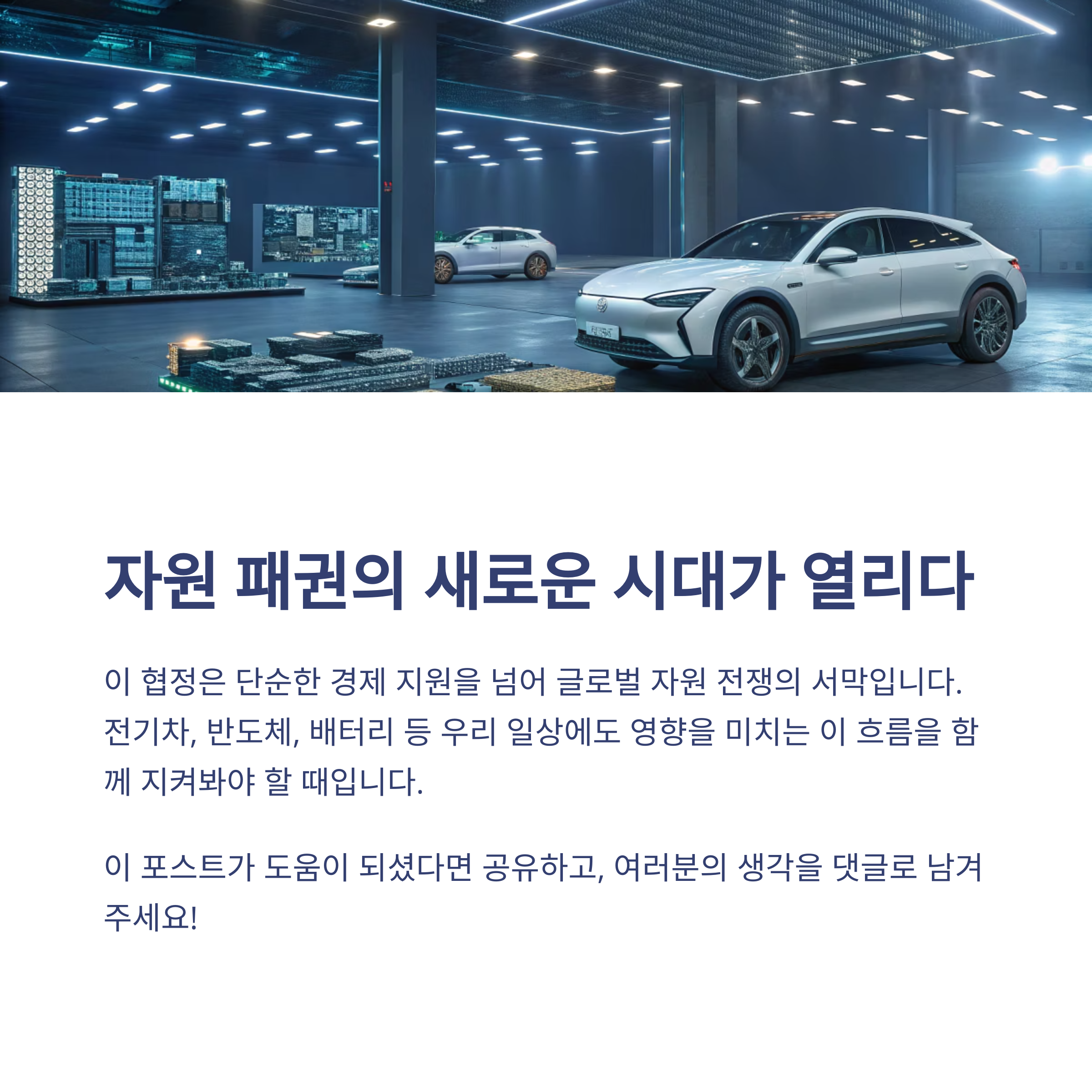 이제는 전쟁이 끝난 이후를 대비할 때입니다. 이 협정이 진정한 파트너십이 될지, 혹은 또 다른 종속의 서막일지는 우리 모두가 지켜봐야 할 문제입니다. 지리적으로는 멀리 떨어져 있어도, 전기차, 반도체, 배터리 등 우리의 일상에도 이어지는 글로벌 자원전쟁. 앞으로 더 많은 정보와 분석을 통해 이 흐름을 읽어야 할 시점입니다.