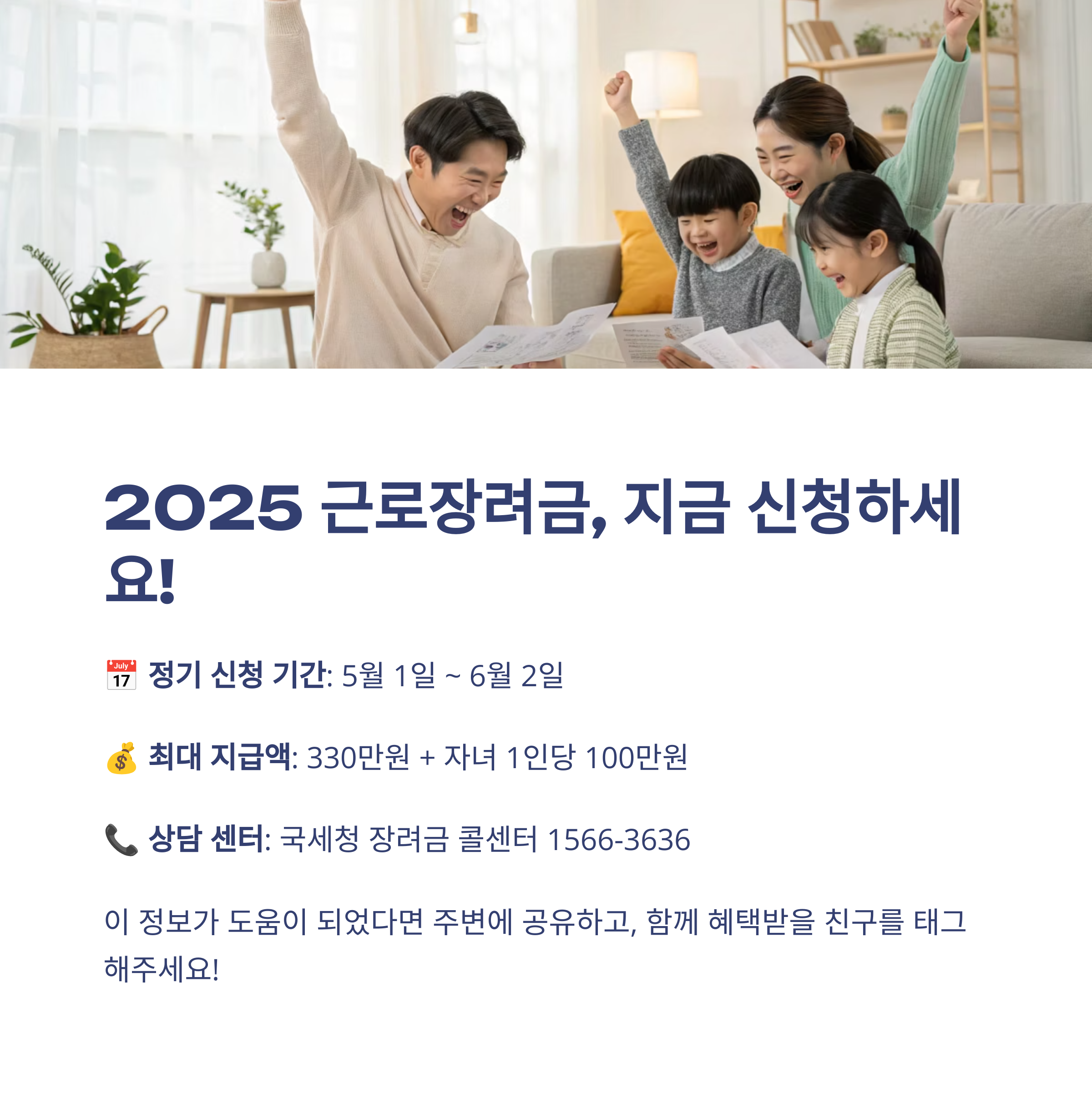 안녕하세요, 여러분! 드디어 기다리던 2025 근로·자녀장려금 신청 시즌이 시작되었어요. 작년엔 마감일 하루 전에 허겁지겁 신청했던 기억이 있는데요, 이번엔 절대 그러지 않으려고 합니다. 특히 올해는 지급 기준과 신청 방식에 변화가 있어서 미리미리 챙겨두면 좋겠더라구요. 저처럼 자격이 되는 분들 많으실 텐데, 오늘 이 글에서 자격 요건부터 신청 방법, 지급일까지 전부 정리해드릴게요. 놓치면 손해니까 끝까지 꼭 확인해보세요!