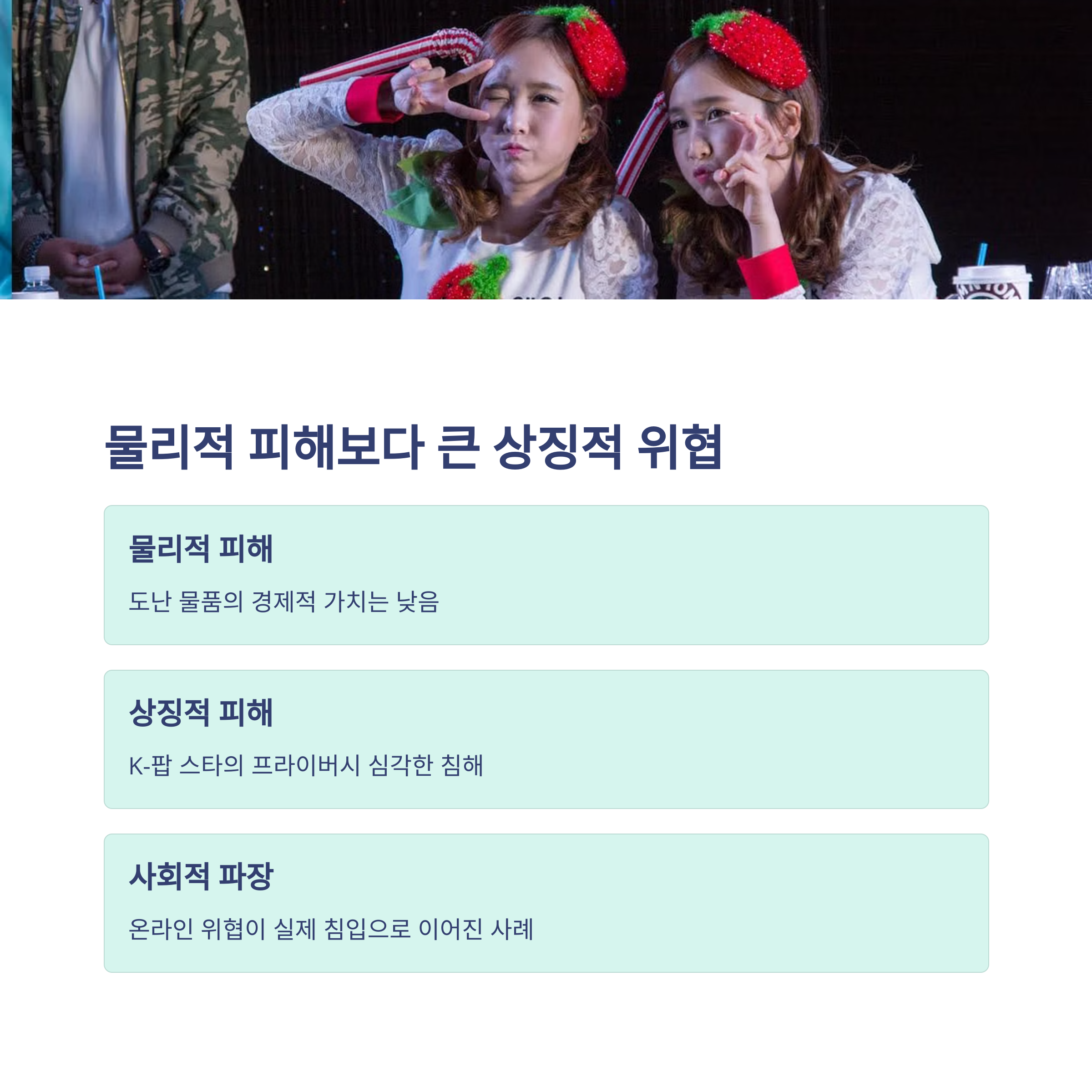 | 상징적 피해 | K-팝 스타의 프라이버시와 안전이 무너졌다는 경고 신호 |