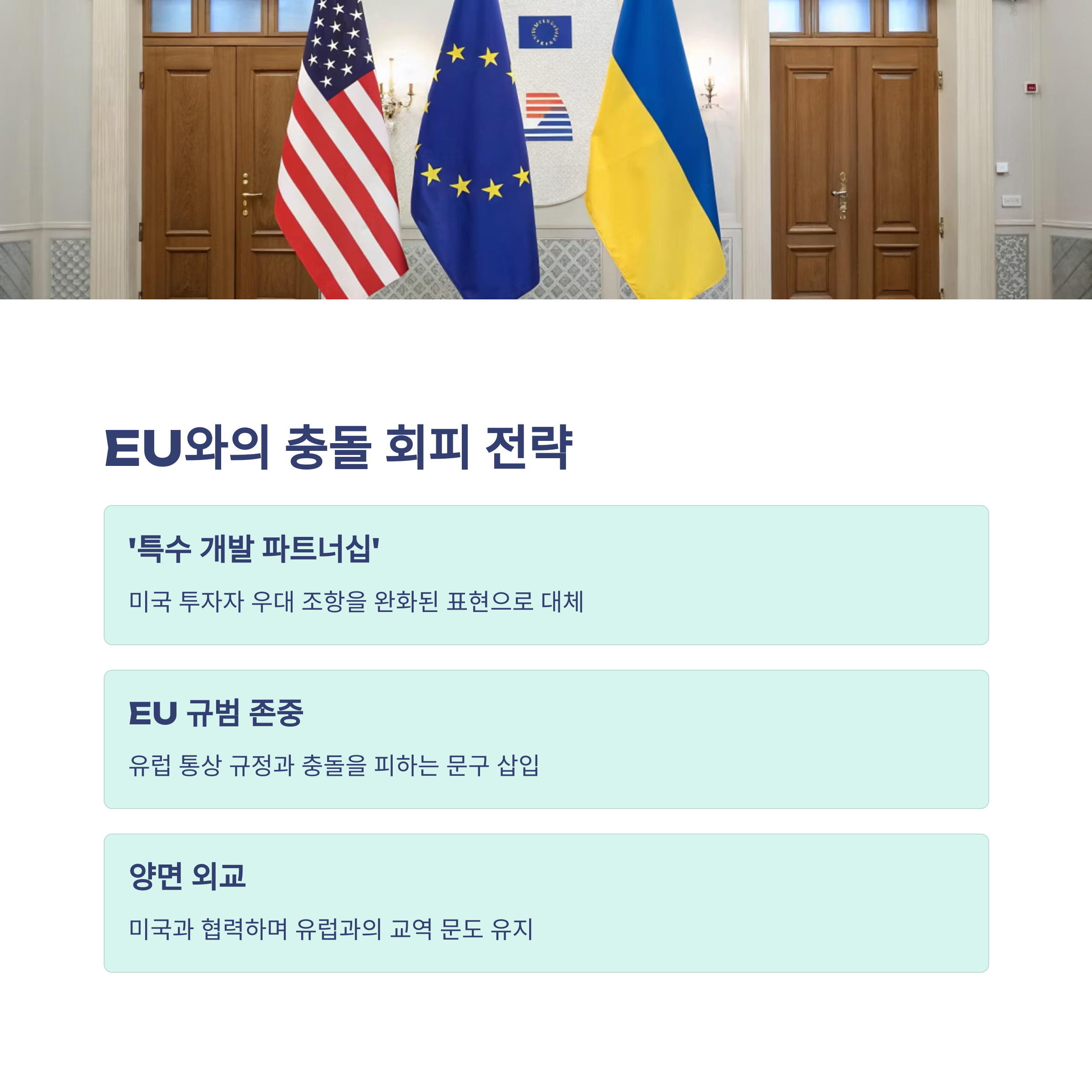 우크라이나는 EU 가입을 목표로 하고 있어, 미국과의 협정이 유럽 통상 규정을 침해하지 않도록 세심한 조율이 있었습니다. 미국 투자자 우대 조항을 '특수 개발 파트너십'으로 표현했고, EU와의 규범 충돌을 피하는 문구도 삽입됐습니다. 우크라이나는 미국과 손을 잡되, 유럽과의 교역 문은 열어두는 전략을 택한 셈입니다.