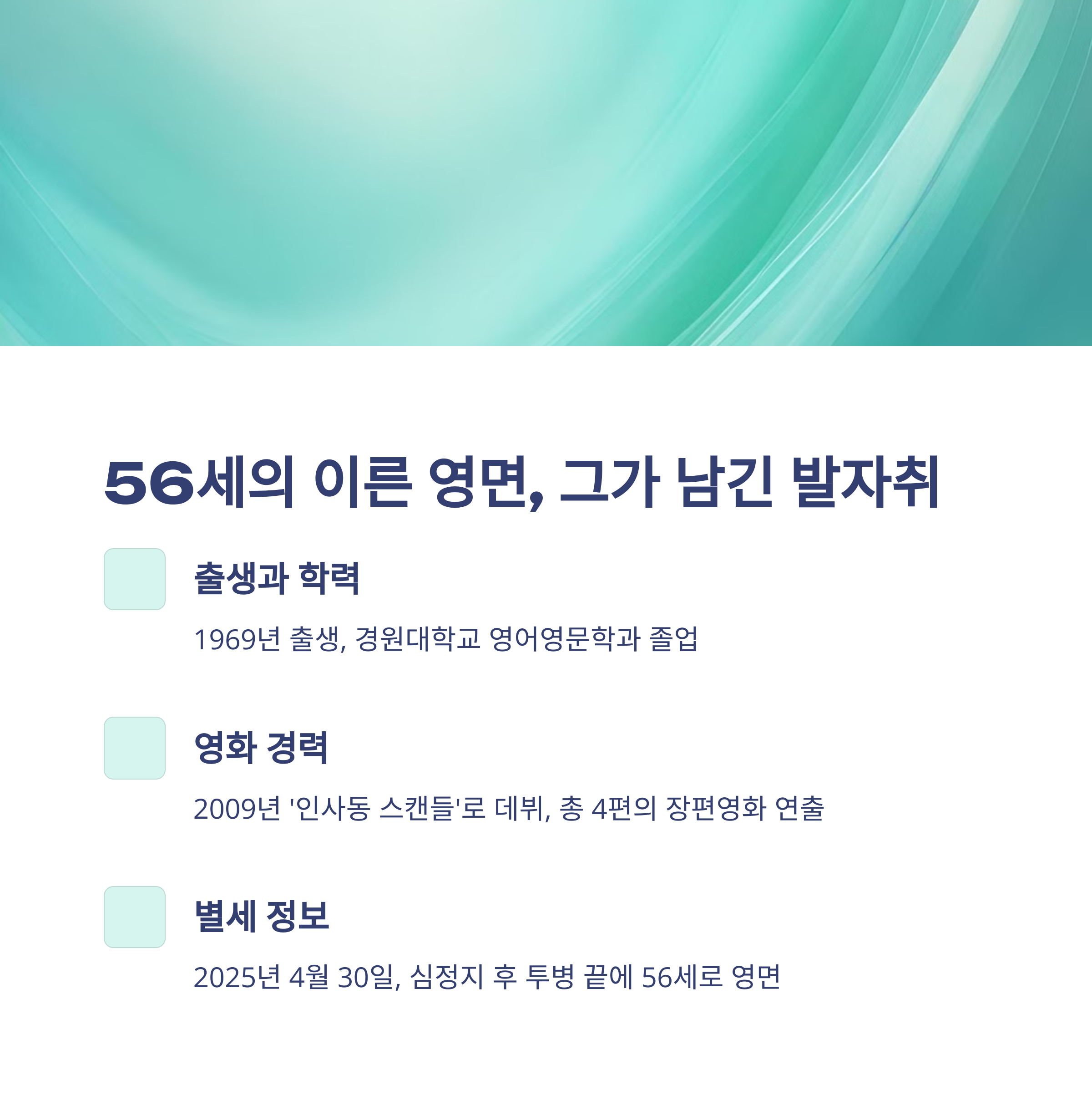 - 동료 감독 A: “한국적 감성과 현대적 스토리텔링을 모두 갖춘 감독이었다.”
