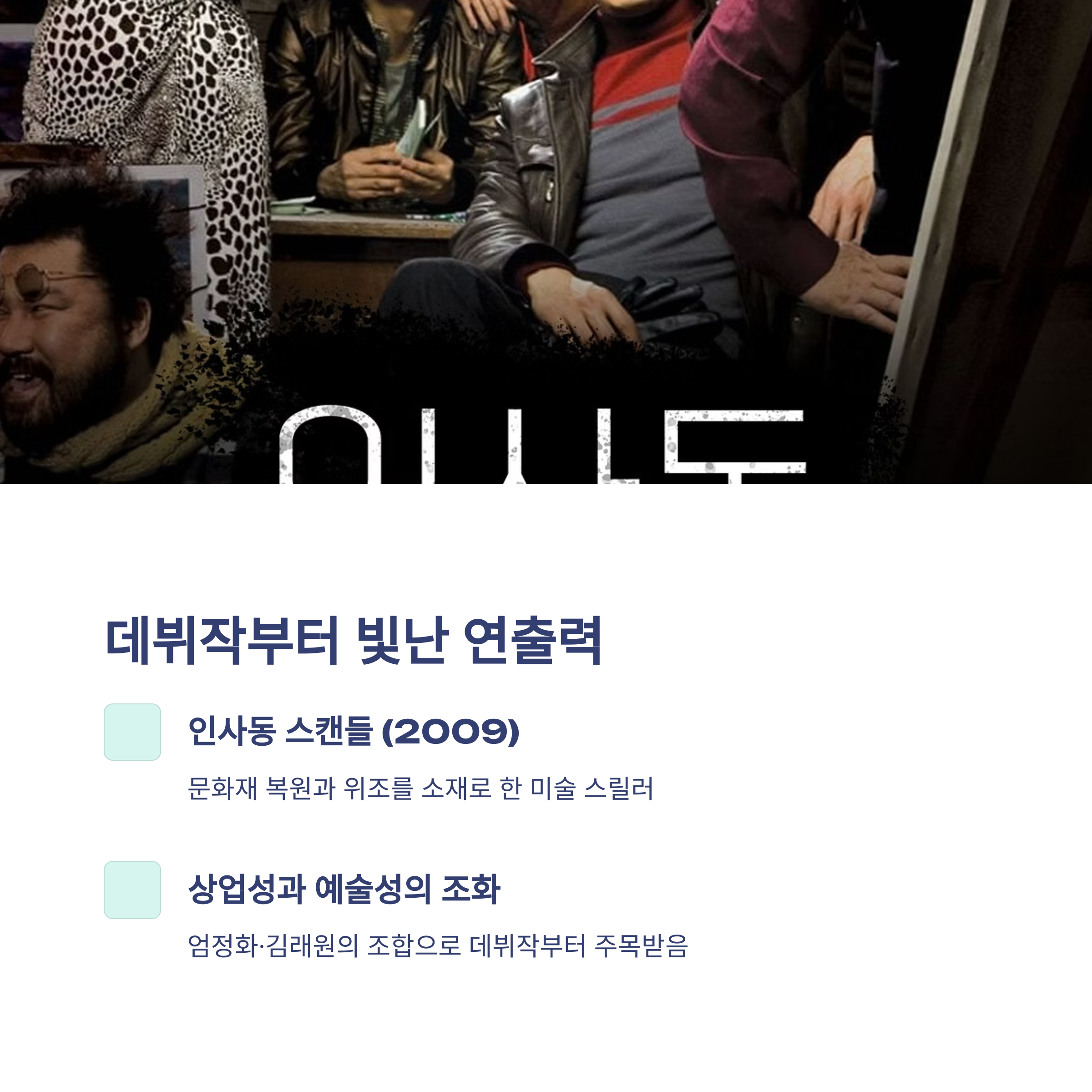 - ‘인사동 스캔들’ (2009) – 미술품 복원과 위조라는 독특한 소재를 다룬 스릴러. 엄정화, 김래원의 조합으로 예술성과 상업성을 동시에 잡음.