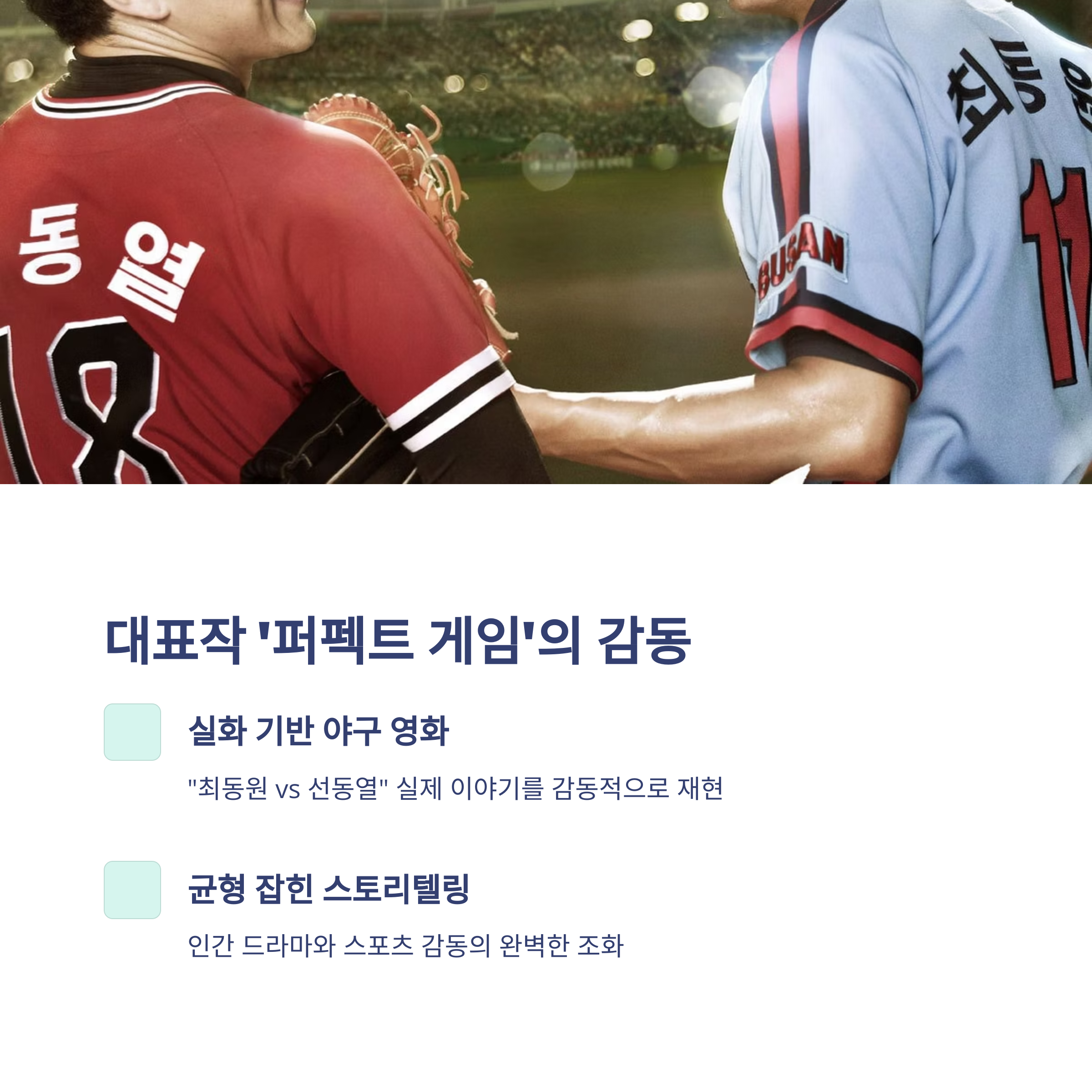 - ‘퍼펙트 게임’ (2011) – 한국 야구사의 전설, 최동원과 선동열의 맞대결을 인간 드라마로 풀어낸 스포츠 영화. 배우들의 연기와 드라마틱한 구성으로 호평.